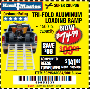 HAUL-MASTER 1500 LB. CAPACITY, 69 IN. X 45 IN. TRI-FOLD ALUMINUM LOADING RAMP Lot No. 90018 Expired: 11/22/19 - $74.99 Coupon Code: '99953337'
