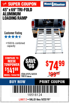 HAUL-MASTER 1500 LB. CAPACITY, 69 IN. X 45 IN. TRI-FOLD ALUMINUM LOADING RAMP Lot No. 90018 Expired: 9/22/19 - $74.99 Coupon Code: '16516124'