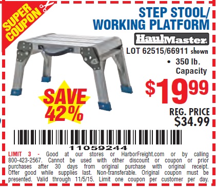 HAUL-MASTER 18 IN. STEP STOOL WORKING PLATFORM Lot No. 66911 Expired: 11/5/15 - $19.99 Coupon Code: '11059244'