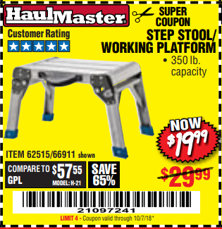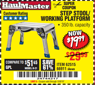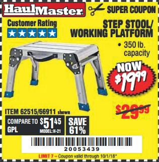 HAUL-MASTER 18 IN. STEP STOOL WORKING PLATFORM Lot No. 66911 Expired: 9/30/18 - $19.99 Coupon Code: '15097214'