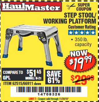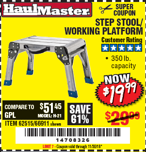 HAUL-MASTER 18 IN. STEP STOOL WORKING PLATFORM Lot No. 66911 Expired: 11/30/18 - $19.99 Coupon Code: '14708326'