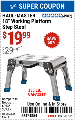 HAUL-MASTER 18 IN. STEP STOOL WORKING PLATFORM Lot No. 66911 Expired: 8/31/20 - $19.99 Coupon Code: '58474854'