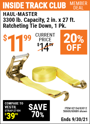 ITC HAUL-MASTER 2" X 27 FT, 3300LB CAPACITY RATCHETING TIE DOWN Lot No. 95106/60689/62134/63012/56669 Expired: 9/30/21 - $11.99 Coupon Code: 'n/a'