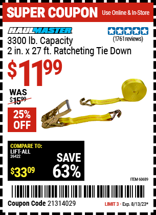 HAUL-MASTER 2" X 27 FT, 3300LB CAPACITY RATCHETING TIE DOWN Lot No. 95106/60689/62134/63012/56669 Expired: 8/13/23 - $11.99 Coupon Code: '21314029'