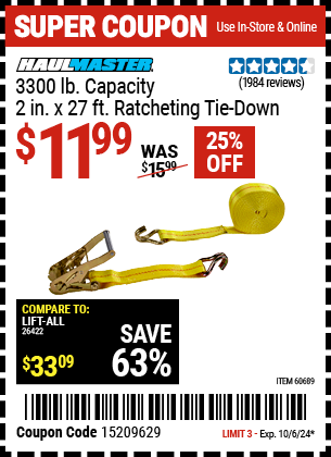 HAUL-MASTER 2" X 27 FT, 3300LB CAPACITY RATCHETING TIE DOWN Lot No. 95106/60689/62134/63012/56669 Expired: 10/5/24 - $11.99 Coupon Code: '15209629'