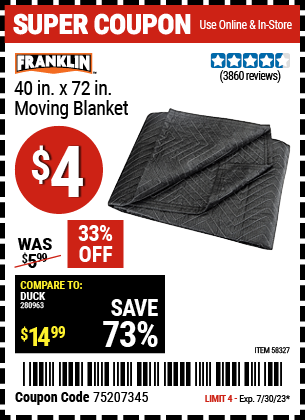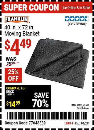 HAUL-MASTER 40 IN. X 72 IN. MOVING BLANKET Lot No. 47262/62336/58327 Expired: 3/9/23 - $4.49 Coupon Code: '77648339'
