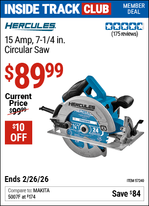 ITC HERCULES 15 AMP, 7-1/4 IN. CIRCULAR SAW Lot No. 57240 Valid Thru: 2/26/26 - $89.99 Coupon Code: 'n/a' (current price - 20% = 0) add to list