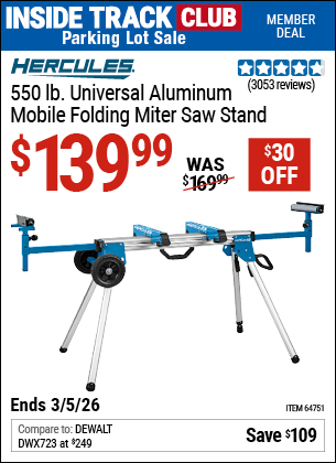 HERCULES 550 LB. UNIVERSAL ALUMINUM MOBILE FOLDING MITER SAW STAND Lot No. 64751 Valid Thru: 3/8/26 - $139.99 Coupon Code: 'n/a' (current price No % off) add to list