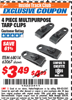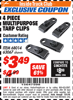 ITC HFT MULTIPURPOSE TARP CLIPS, 4-PIECE Lot No. 63067 Expired: 9/30/17 - $3.49 Coupon Code: '20855502'