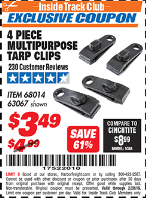 ITC HFT MULTIPURPOSE TARP CLIPS, 4-PIECE Lot No. 63067 Expired: 2/28/19 - $3.49 Coupon Code: '17522010'