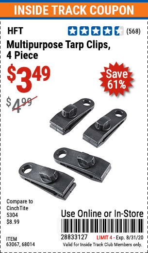 ITC HFT MULTIPURPOSE TARP CLIPS, 4-PIECE Lot No. 63067 Expired: 8/31/20 - $3.49 Coupon Code: '28833127'