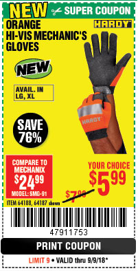 HI-VIS MECHANIC'S GLOVES ORANGE/YELLOW Lot No. 64188/64187/64185/64186 Expired: 9/9/18 - $5.99 Coupon Code: '47911753'