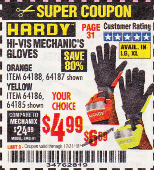 HI-VIS MECHANIC'S GLOVES ORANGE/YELLOW Lot No. 64188/64187/64185/64186 Expired: 12/31/18 - $4.99 Coupon Code: '34762819'
