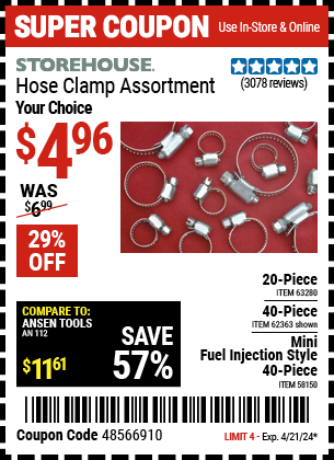 HOSE CLAMP (20-PIECE OR 40-PIECE OR MINI FUEL-INJECTION STYLE 40-PIECE) Lot No. 63280/62363/58150 Expired: 4/21/24 - $4.96 Coupon Code: '48566910'
