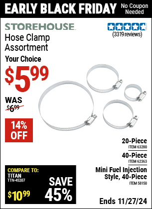 HOSE CLAMP (20-PIECE OR 40-PIECE OR MINI FUEL-INJECTION STYLE 40-PIECE) Lot No. 63280/62363/58150 Expired: 11/27/24 - $5.99 Coupon Code: 'n/a'