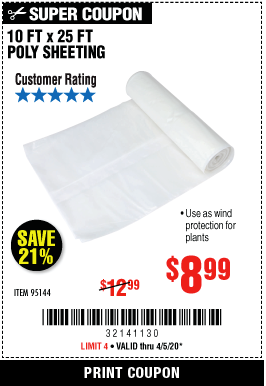 HUSKY 10 FT. X 25 FT. POLY SHEETING Lot No. 95144 Expired: 6/30/20 - $8.99 Coupon Code: '32141130'