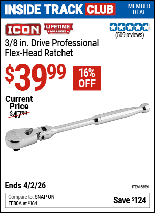 ITC ICON 3/8 IN. DRIVE PROFESSIONAL FLEX-HEAD RATCHET Lot No. 58591 Expired: 2/26/26 - $39.99 Coupon Code: 'n/a'