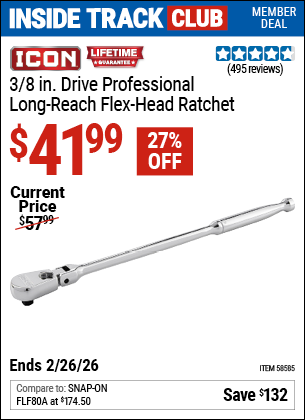 ITC ICON 3/8 IN. DRIVE PROFESSIONAL LONG-REACH FLEX-HEAD RATCHET Lot No. 58585 Valid Thru: 2/26/26 - $41.99 Coupon Code: 'n/a' (current price - 20% = 0) add to list