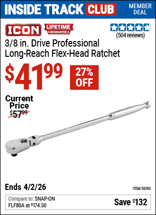 ITC ICON 3/8 IN. DRIVE PROFESSIONAL LONG-REACH FLEX-HEAD RATCHET Lot No. 58585 Expired: 2/26/26 - $41.99 Coupon Code: 'n/a'