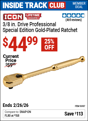 ITC ICON 3/8 IN. DRIVE PROFESSIONAL SPECIAL EDITION GOLD-PLATED RATCHET Lot No. 56907 Valid Thru: 2/26/26 - $47.99 Coupon Code: 'n/a' (current price - 20% = 0) add to list