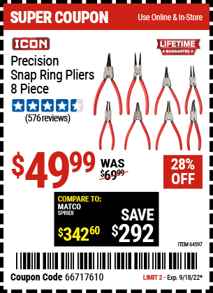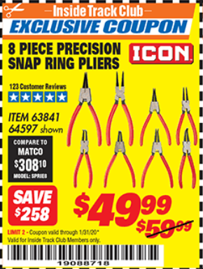 ITC ICON PRECISION SNAP RING PLIERS, 8-PIECE Lot No. 64597 Expired: 9/30/21 - $59.99 Coupon Code: 'n/a'