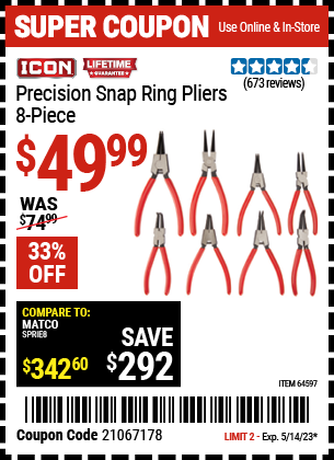 ICON PRECISION SNAP RING PLIERS, 8-PIECE Lot No. 64597 Expired: 5/14/23 - $49.99 Coupon Code: '24678328'