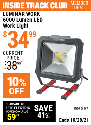 ITC LUMINAR WORK 6000 LUMEN LED WORK LIGHT Lot No. 58487 Valid Thru: 10/30/25 - $24.99 Coupon Code: 'n/a' (current price - 10% = 0) add to list