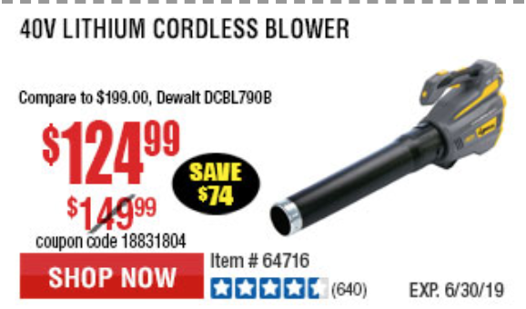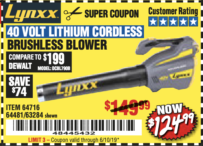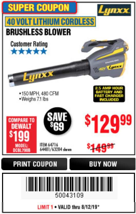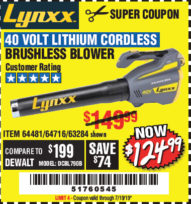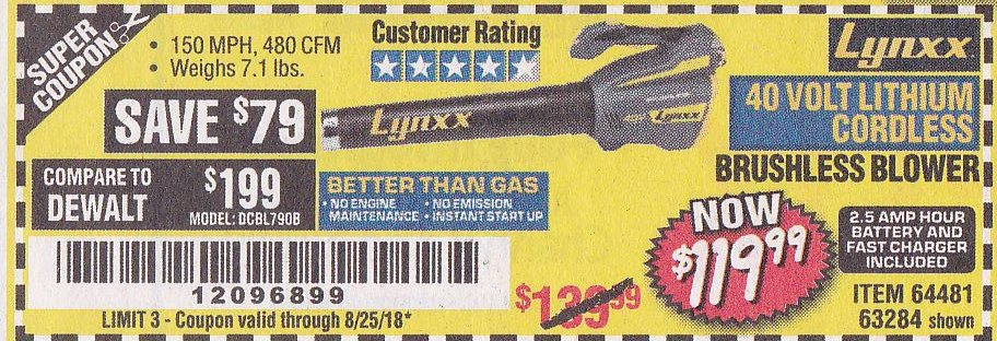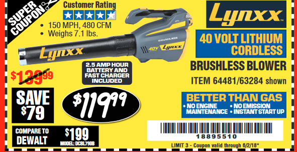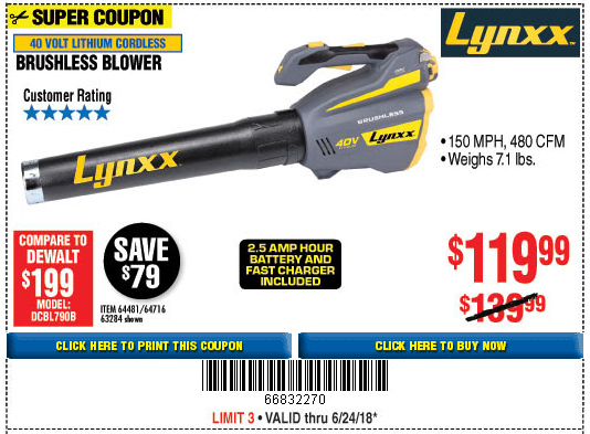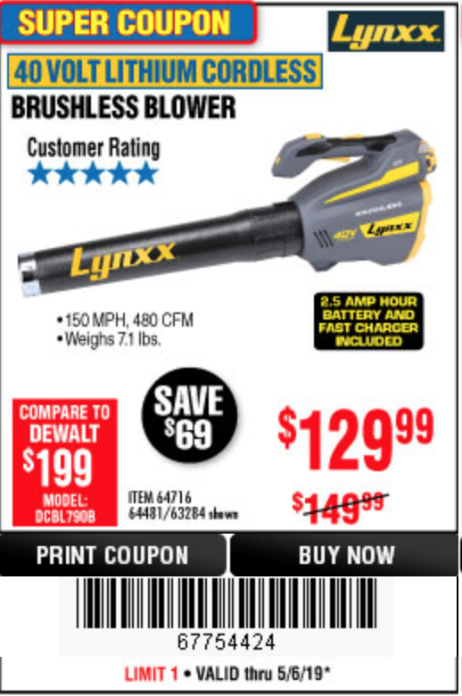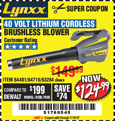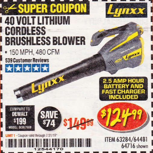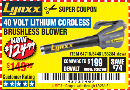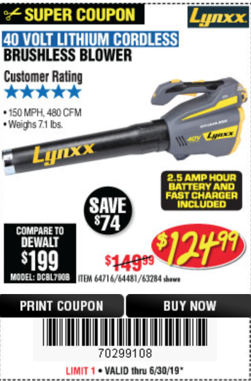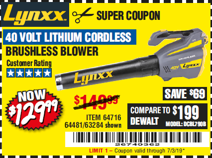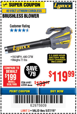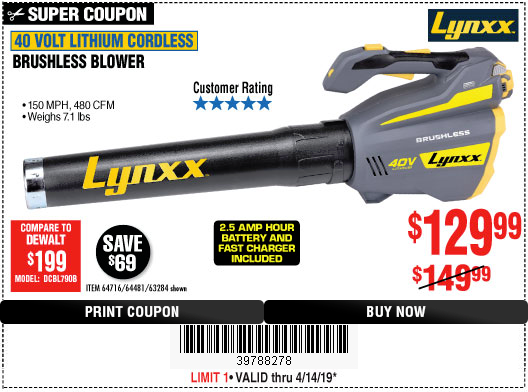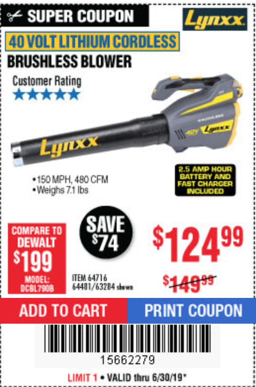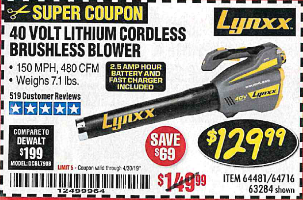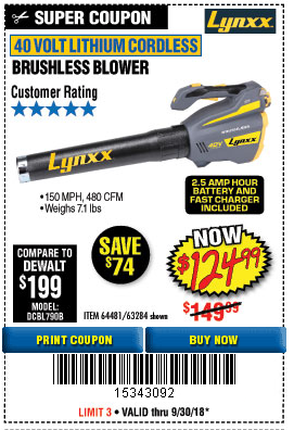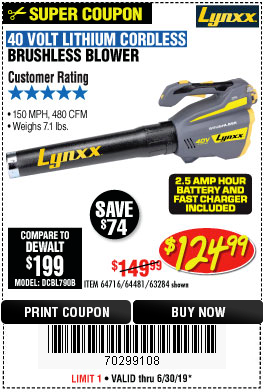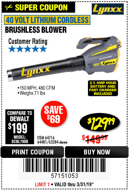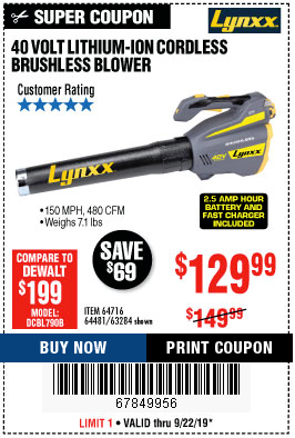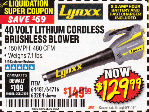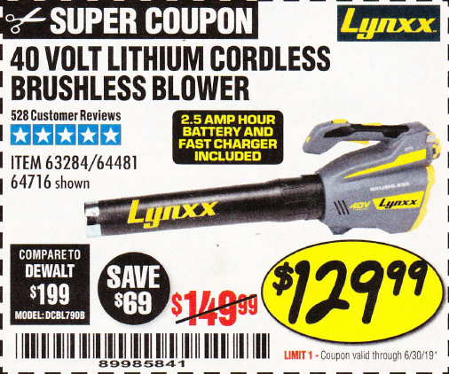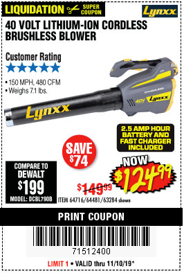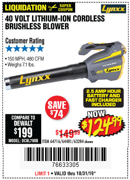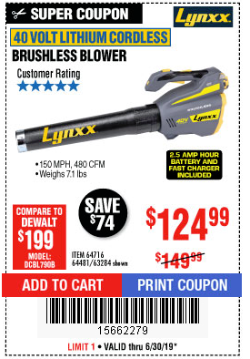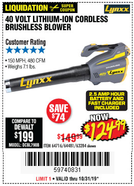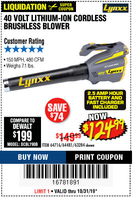 LYNXX 40 VOLT LITHIUM CORDLESS BRUSHLESS BLOWER Lot No. 64481/63284/64716 Expired: 4/30/19 - $129.99 Coupon Code: '12499964'