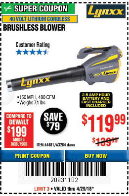 LYNXX 40 VOLT LITHIUM CORDLESS BRUSHLESS BLOWER Lot No. 64481/63284/64716 Expired: 4/29/18 - $119.99 Coupon Code: '20931102'