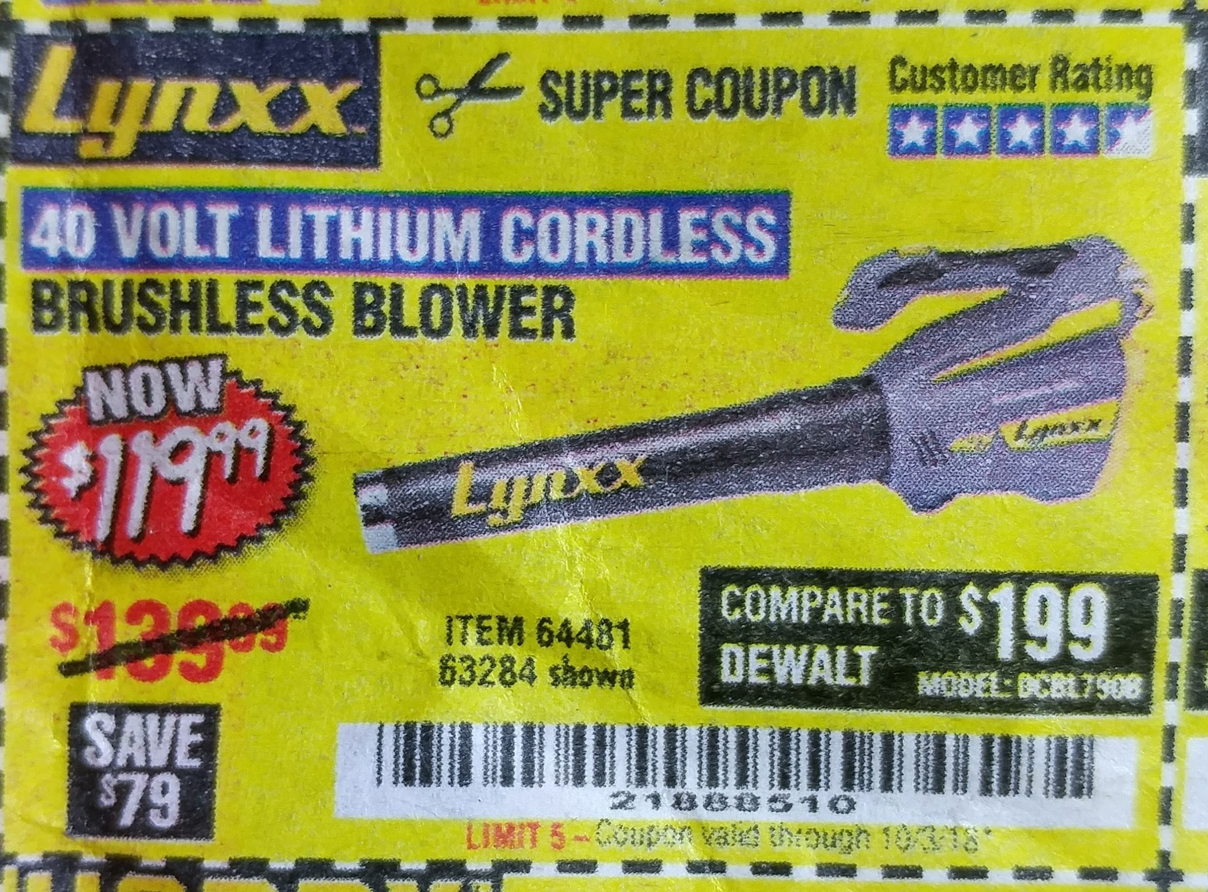 LYNXX 40 VOLT LITHIUM CORDLESS BRUSHLESS BLOWER Lot No. 64481/63284/64716 Expired: 11/10/18 - $119.99 Coupon Code: '43602057'