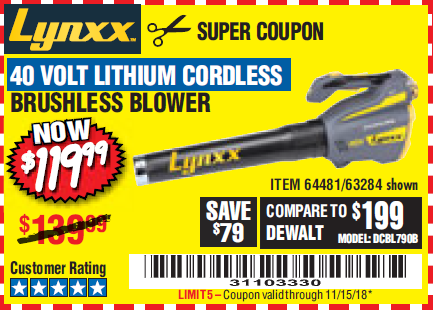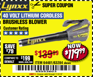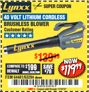 LYNXX 40 VOLT LITHIUM CORDLESS BRUSHLESS BLOWER Lot No. 64481/63284/64716 Expired: 11/15/18 - $119.99 Coupon Code: '31103330'