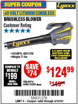 LYNXX 40 VOLT LITHIUM CORDLESS BRUSHLESS BLOWER Lot No. 64481/63284/64716 Expired: 8/13/18 - $124.99 Coupon Code: '56931276'