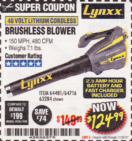 LYNXX 40 VOLT LITHIUM CORDLESS BRUSHLESS BLOWER Lot No. 64481/63284/64716 Expired: 11/18/18 - $119.99 Coupon Code: '67219168'