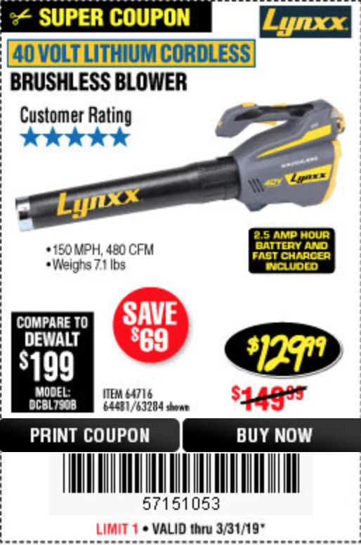 LYNXX 40 VOLT LITHIUM CORDLESS BRUSHLESS BLOWER Lot No. 64481/63284/64716 Expired: 3/31/19 - $129.99 Coupon Code: '57151053'