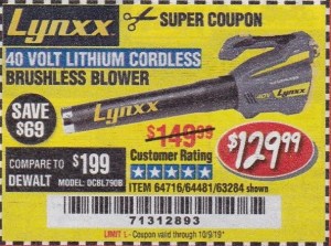 LYNXX 40 VOLT LITHIUM CORDLESS BRUSHLESS BLOWER Lot No. 64481/63284/64716 Expired: 8/12/19 - $129.99 Coupon Code: '50043109'