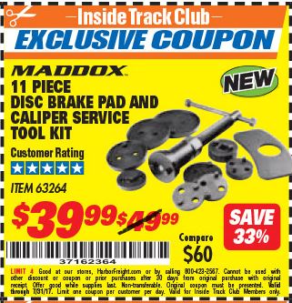 MADDOX DISC BRAKE PAD AND CALIPER SERVICE TOOL KIT 11 PC. Lot No. 63264 Expired: 10/31/24 - $29.99 Coupon Code: 'n/a'