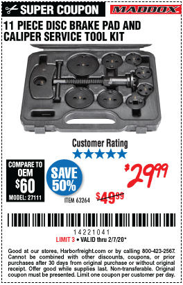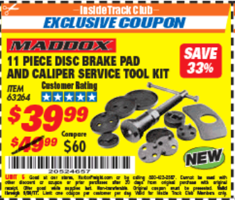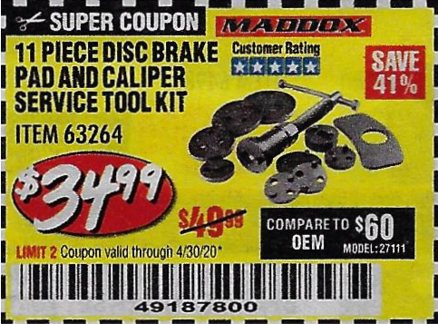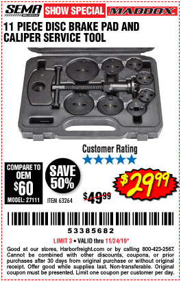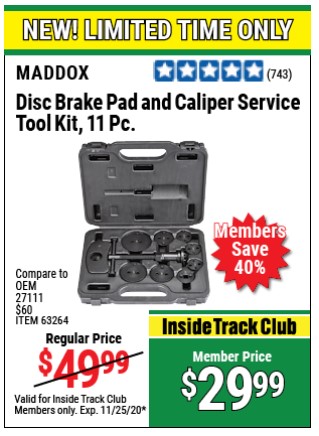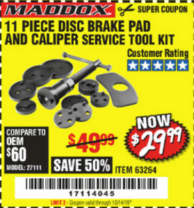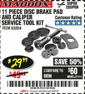 MADDOX DISC BRAKE PAD AND CALIPER SERVICE TOOL KIT 11 PC. Lot No. 63264 Expired: 11/25/20 - $29.99 Coupon Code: 'n/a'