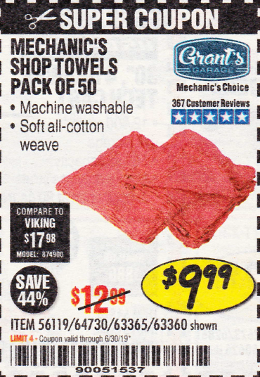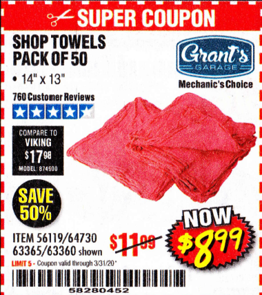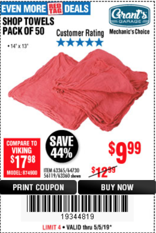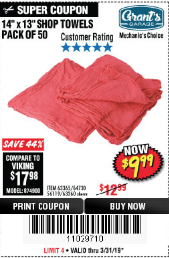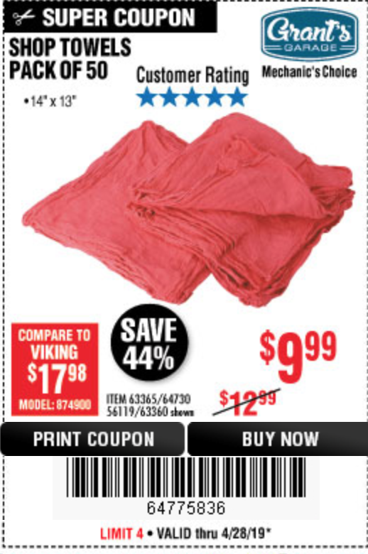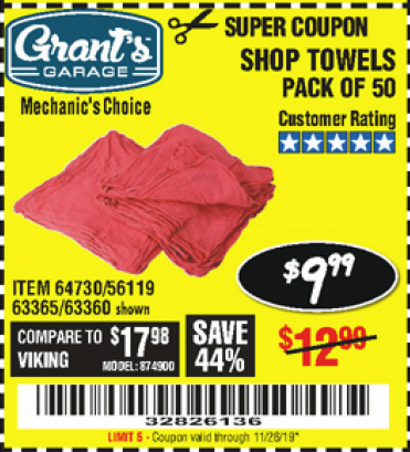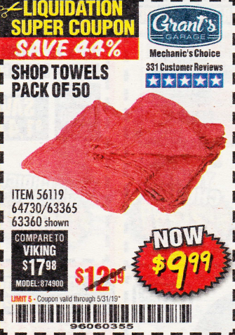 MECHANICS SHOP TOWELS Lot No. 56119/64730/63365/63360 Expired: 4/28/19 - $9.99 Coupon Code: '64775836'