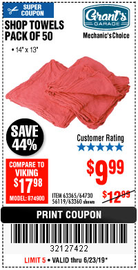 MECHANICS SHOP TOWELS Lot No. 56119/64730/63365/63360 Expired: 6/23/19 - $9.99 Coupon Code: '32127422'