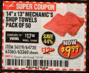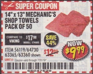 MECHANICS SHOP TOWELS Lot No. 56119/64730/63365/63360 Expired: 7/31/19 - $9.99 Coupon Code: '66047629'
