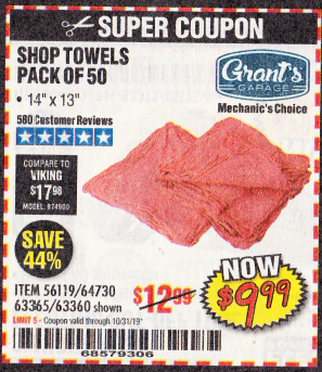 MECHANICS SHOP TOWELS Lot No. 56119/64730/63365/63360 Expired: 10/31/19 - $9.99 Coupon Code: '68579306'