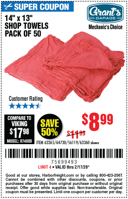 MECHANICS SHOP TOWELS Lot No. 56119/64730/63365/63360 Expired: 2/17/20 - $8.99 Coupon Code: '75699493'