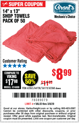 MECHANICS SHOP TOWELS Lot No. 56119/64730/63365/63360 Expired: 3/8/20 - $8.99 Coupon Code: '78089079'