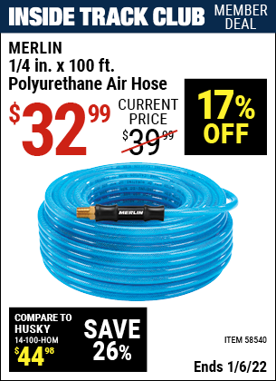 ITC MERLIN 1/4 IN. X 100 FT. POLYURETHANE AIR HOSE Lot No. 58540 Expired: 1/6/22 - $32.99 Coupon Code: 'n/a'