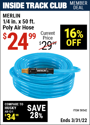 MERLIN 1/4 IN. X 50 FT. POLYURETHANE AIR HOSE Lot No. 58542 Expired: 2/4/24 - $19.99 Coupon Code: '68976858'