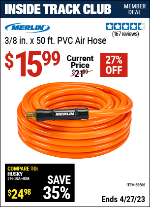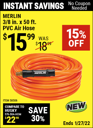 MERLIN 3/8 IN. X 50 FT. PVC AIR HOSE Lot No. 58506 Expired: 1/27/22 - $15.99 Coupon Code: 'n/a'