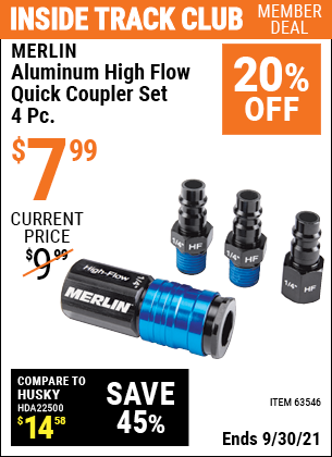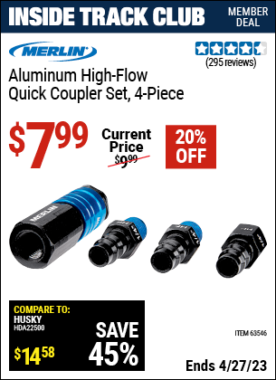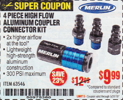 MERLIN 4 PIECE HIGH FLOW ALUMINIUM COUPLER CONNECTOR KIT Lot No. 63546 Expired: 5/31/19 - $9.99 Coupon Code: '50975360'