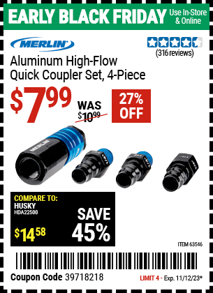 MERLIN 4 PIECE HIGH FLOW ALUMINIUM COUPLER CONNECTOR KIT Lot No. 63546 Expired: 11/19/23 - $7.99 Coupon Code: '39718218'
