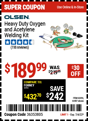 ITC OLSEN HEAVY DUTY OXYGEN AND ACETYLENE WELDING KIT Lot No. 64407 Expired: 3/31/22 - $189.99 Coupon Code: 'n/a'
