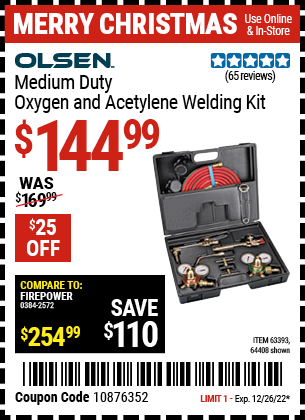 OLSEN MEDIUM DUTY OXYGEN AND ACETYLENE WELDING KIT Lot No. 64408 Expired: 12/26/22 - $144.99 Coupon Code: '10876352'
